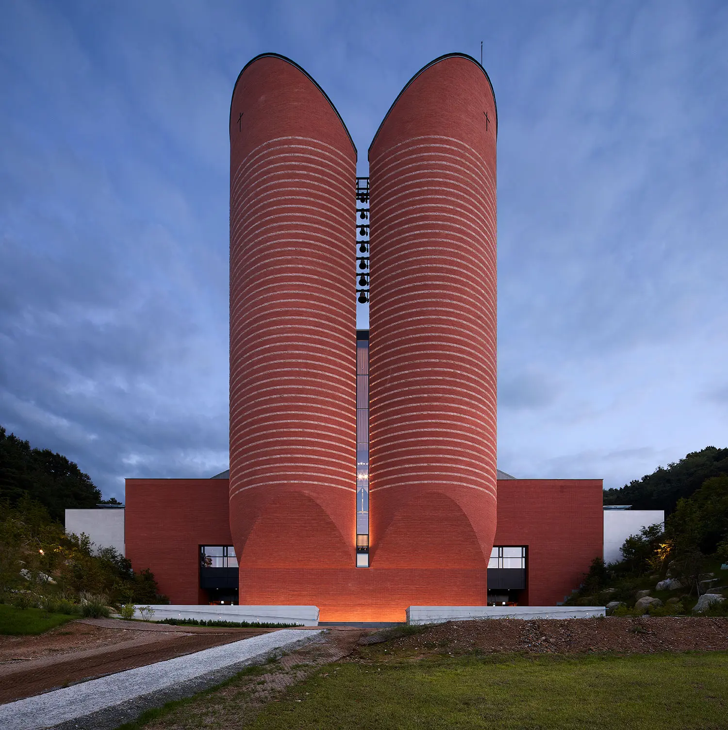 멀리 두 개의 탑으로 순례자를 이끄는 대성당은 성지 안쪽 골짜기를 감싸 안은 듯한 곳에 자리하고 있다. 마리오 보타는 처음 남양성모성지를 방문했을 때 오랜 시간 다져진 순례의 흐름을 읽어내고 이상각 신부가 가꾸어온 묵주기도길에 주목했다. 묵주기도길과 작은 기도처들, 그리고 땅에 새겨진 수많은 기도의 흔적을 하나로 모아 이를 완성하고자 했다. 그리고 은총의 빛처럼 퍼져 나갈 수 있는 그 중심에 대성당을 놓았다. 정면에 솟은 두 개의 탑은 등대처럼 성지의 중심을 지키고, 그 뒤로 이어지는 본당은 대지에 깊이 뿌리내려 있다. 이는 단순한 건축적 구성을 넘어 성지의 시간과 순례자의 마음이 도달하는 거룩한 중심을 이룬다.