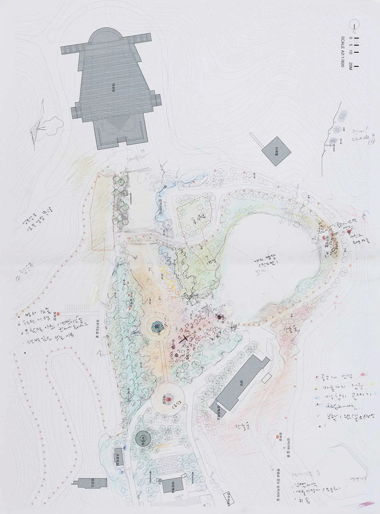 남양성모성지는 성지 전체가 따뜻한 위로와 치유를 건네는 공간이 되기를 바라며, 대성당 봉헌을 계기로 성지의 순례 동선과 자연 환경을 정비하기 시작했다. 그 여정을 함께한 이는 조경가 정영선이다. 그는 성지를 세 부분으로 나누어 바라보았다. 도심과 만나는 진입부, 외부 행사가 열리는 중앙광장, 그리고 깊은 골짜기 안에 자리한 대성당. 서로 다른 성격을 지닌 이 세 공간을 어떻게 하나의 흐름으로 연결할 것인가. 조경가는 이를 성지 조경에서 가장 중요한 과제로 받아들였다. 정영선은 다음과 같이 소개한다. “조경의 원칙은 원지형, 즉 산과 골짜기, 경사를 존중하고 복원하는 것, 그리고 순교의 장이자 기도의 장소인 이 땅이 지닌 특성에 집중하는 것이었습니다.” 성지의 풍경은 그렇게 ‘조성’이 아니라 ‘응답’의 방식으로 다시 쓰이기 시작했다.